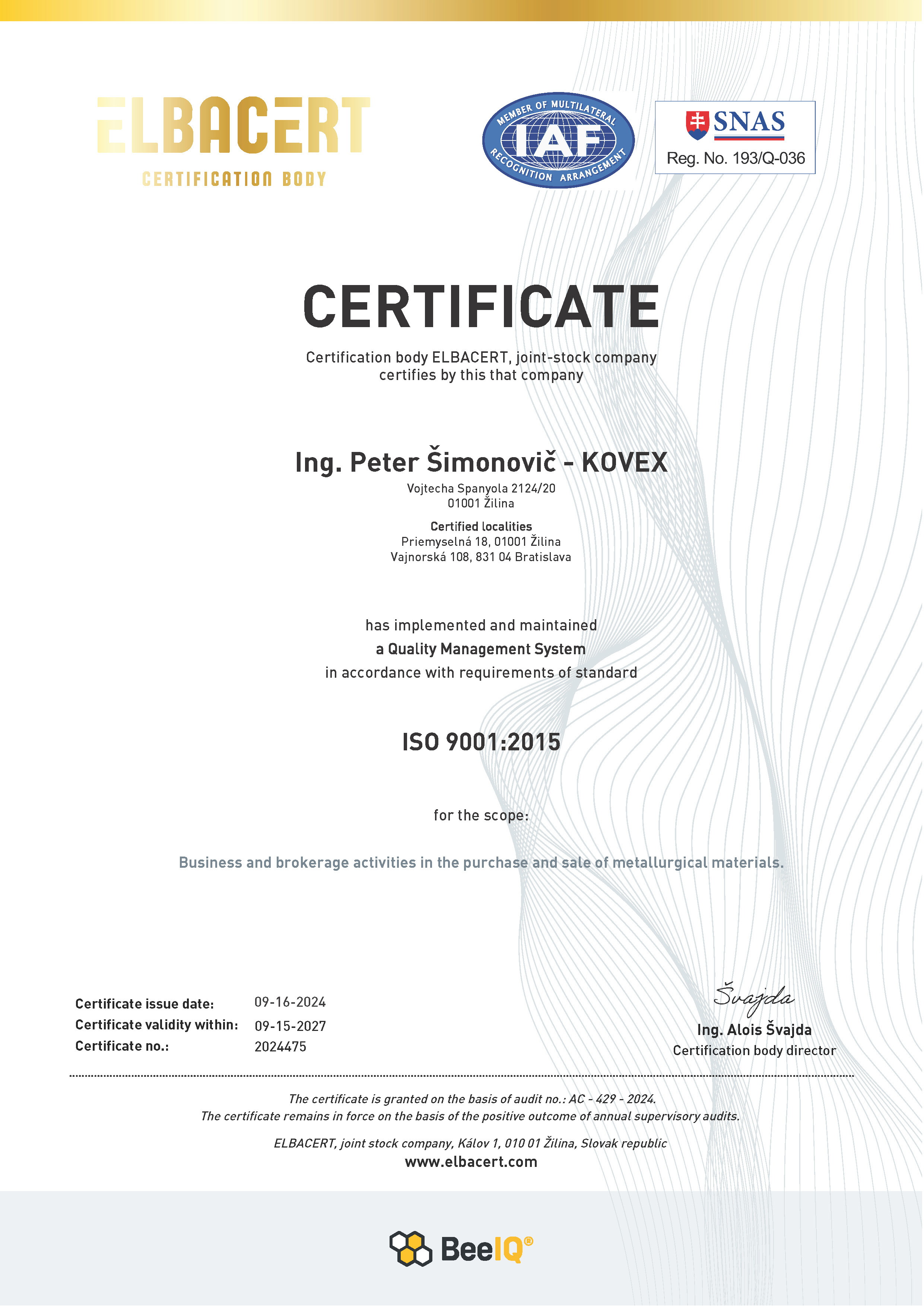 Zavedený systém manažérstva kvality v súlade s ISO 9001:2015